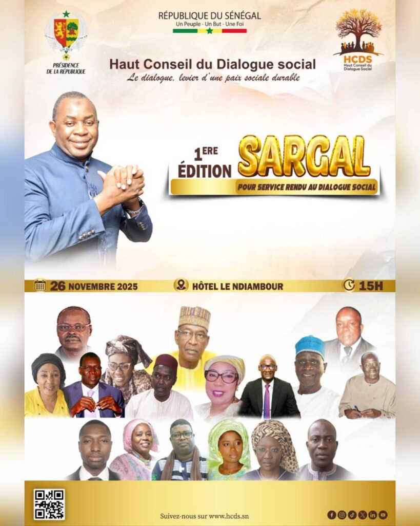 Le Haut Conseil du Dialogue social (HCDS) organise une cérémonie de SARGAL, en vue de rendre hommage à ses anciens membres pour service rendu au dialogue social au Sénégal et dans le monde. Date : 26 novembre 2025 Lieu : Hôtel Le Ndiambour Heure : 13h00 À travers cette initiative symbolique, le HCDS souhaite saluer l’engagement, le dévouement et la contribution remarquable de celles et ceux qui ont œuvré pour la promotion d’un climat social apaisé et durable au Sénégal. Cette première édition du SARGAL sera présidée par Monsieur Mamadou Lamine DIANTÉ, Président du Haut Conseil du Dialogue social.