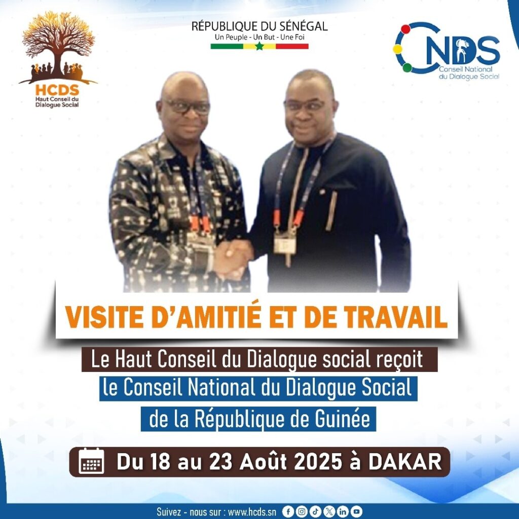 Le Haut Conseil du Dialogue Social du Sénégal a l’honneur d’accueillir, du 18 au 23 août 2025 à Dakar, le Conseil National du Dialogue Social de la République de Guinée. Une rencontre placée sous le signe du partage d’expériences, du renforcement des liens fraternels et de la promotion d’un dialogue social constructif entre nos deux nations.