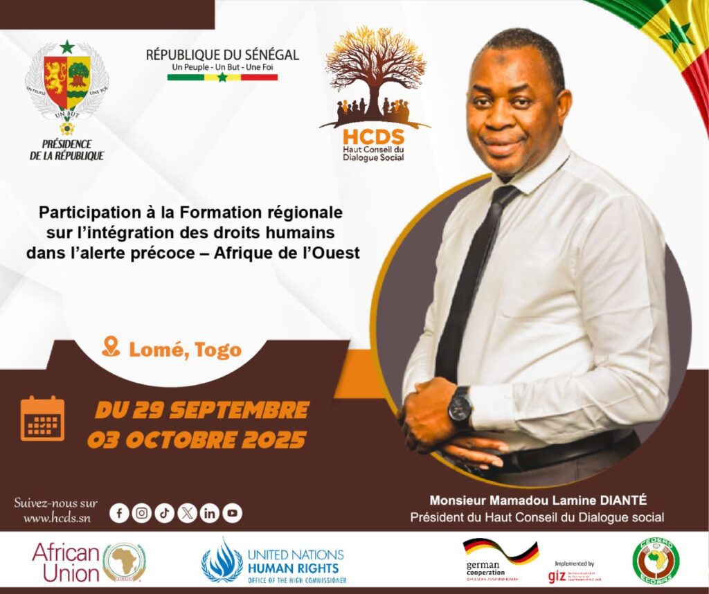 Aujourd’hui, le Président du Haut Conseil du Dialogue Social (HCDS), M. Mamadou Lamine DIANTE, a pris part à la cérémonie d’ouverture de la formation régionale sur l’intégration des droits de l’homme dans l’alerte précoce, qui se tient à Lomé, Togo, du 29 septembre au 3 octobre 2025.Cette initiative, portée par l’Union Africaine en partenariat avec le HCDH, la CEDEAO et la GIZ, vise à renforcer les capacités des acteurs nationaux et régionaux en matière de prévention des conflits.Elle s’inscrit dans la dynamique de consolidation de la paix et de la sécurité en Afrique de l’Ouest, en mettant les droits humains au cœur des mécanismes d’alerte.Le HCDS, fidèle à sa mission de promotion du dialogue social et de la stabilité, s’associe pleinement à cette démarche.Cette rencontre permettra aux participants de développer de nouveaux outils et indicateurs de suivi des violations des droits humains.Elle favorisera également l’échange d’expériences et de bonnes pratiques entre institutions, OSC et mécanismes régionaux.Le Président du HCDS a salué cette initiative comme une étape majeure vers des réponses plus proactives aux crises.Il a réaffirmé l’engagement du Sénégal à contribuer à la prévention des conflits dans la sous-région.En plaçant la dignité humaine au centre des actions, cette formation incarne une vision partagée d’une Afrique plus juste et pacifique.Le HCDS continuera à œuvrer pour des partenariats solides en faveur de la paix et du développement durable.