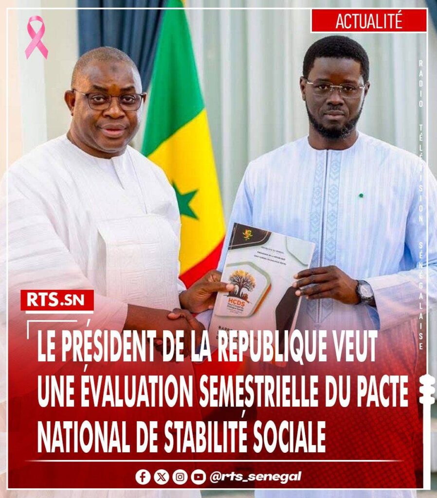 Le Président de la République, Bassirou Diomaye Faye, a chargé le Premier ministre de réaliser une évaluation semestrielle et sectorielle de la mise en œuvre du plan d’actions issu du Pacte national de stabilité sociale, en collaboration avec les partenaires sociaux et le Haut conseil du dialogue social (HCDS). Selon le communiqué du Conseil des ministres de ce mercredi, cette évaluation devra être menée dans chaque ministère et prendra également en compte les doléances des centrales syndicales. Le Chef de l’État a rappelé que la signature de ce pacte, le 1er mai 2025, représente un tournant majeur dans le renforcement du dialogue social tripartite entre le gouvernement, les syndicats et le patronat. Ce pacte s’inscrit par ailleurs en cohérence avec l’Agenda national de transformation, visant une croissance inclusive et durable. Bassirou Diomaye Faye a insisté sur la généralisation de la création des comités sectoriels et spécialisés de dialogue social afin de promouvoir une véritable culture du dialogue dans toutes les sphères. Par ailleurs, le président a souligné la nécessité d’une « évaluation prospective » des actions du HCDS. Il a demandé au ministre du Travail et au président du Haut conseil de proposer, d’ici fin décembre 2025, un nouveau cadre pour les missions, l’organisation et le fonctionnement de cette institution. A l’occasion, le Président Faye a chargé le ministre du Travail, Olivier Boucal, de préparer, en concertation avec tous les acteurs concernés, la prochaine Conférence sociale dont le thème retenu est « La productivité au travail »._ Radio Télévision Sénégalaise